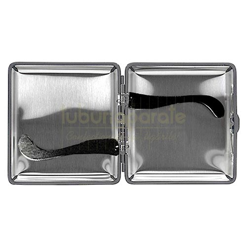 Tabachera are o capacitate de pana la 20 de tigari si este prevazuta cu clapete metalice pentru sustinerea acestora. Dimensiunile de 9,7 x 9,2 x 1,5 cm permit o organizare eficienta, pastrand tigarile protejate si usor accesibile. Este o alegere practica pentru cei care doresc un accesoriu fiabil, cu un aspect relaxat si actual.